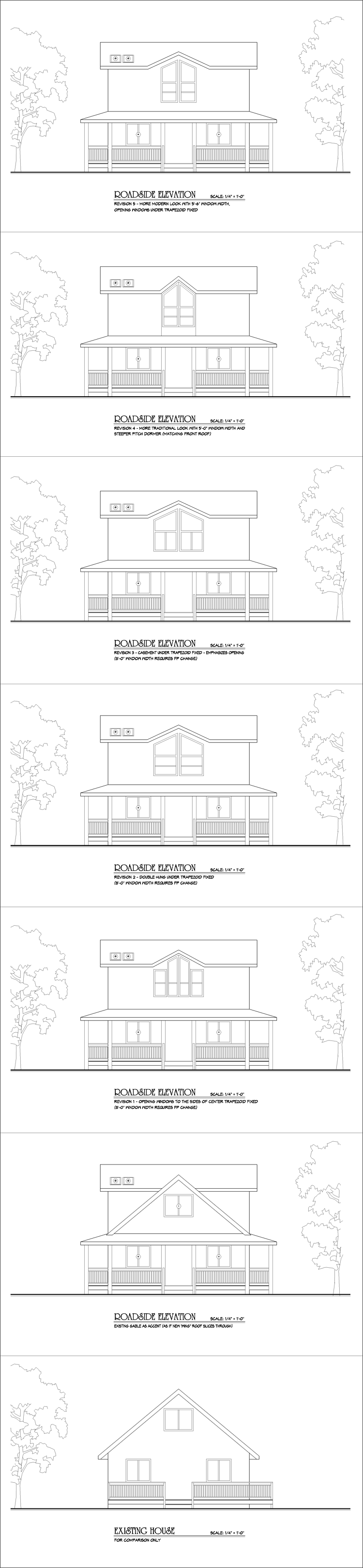 note 1: Revision 1, 2, and 3, or opening windows to the side of double trapezoid fixed with an overall upper window width of ~ 8’-0” require a floor plan change and slight loss of closet space. Revisions 4 and 5 with an upper window width of 5’-6” or less fit existing upper floorplan. |